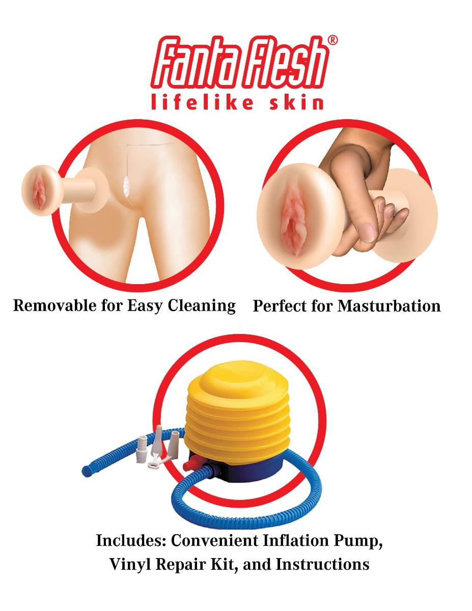 I'm a pleasingly plump BBW and I'm the ultimate fantasy girl for all you chubby chasers! If you like your woman with curves in all the right places, there's plenty of me to love! I've got huge tits, a big round ass, and an even bigger appetite for cock! If you're ready to nestle in the folds of my voluptuous body, I'm ready to smother you with every pound of me! I'm full-figured and built for fucking, so what are you waiting for?" This incredible plus-size inflatable love doll was meticulously designed with realistic features for a truly lifelike experience. Her sexy 3-D formed head features realistic eyelashes and a luxurious head of real hair that's begging to be pulled! Watch her really come to life with arms that swivel 360 degrees and pudgy fingers and toes topped with cute pink polish. Give her firm, super-sized breasts a squeeze while you enjoy her ultra-lifelike Fanta-Flesh™ pussy, and plump ass that feel even better than the real thing! The Fanta-Flesh™ pussy and ass are removable for easy in-depth cleaning, and can even be enjoyed separately for masturbation. An inflation pump, vinyl repair kit, and instructions are conveniently included.