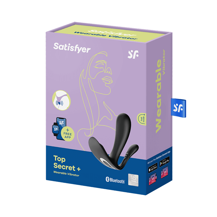 CONFIDENTIAL! TOP SECRET INFORMATION FOLLOWS: The Top Secret wearable vibrator features a flat, ergonomic base, allowing for maximum comfort, as well as a ridged shaft for clitoral stimulation. Ergonomically curved to perfectly hit the G-spot, experience strong vibrations throughout due to the drop-like shape! Bluetooth enabled, the Top Secret connects to the award-winning, free, Satisfyer Connect app, giving you the option to take control of your pleasure and start your journey while on the go. The Top Secret is made of body safe silicone, is rechargeable, and is IPX7 Waterproof rated. Can you keep the secret?